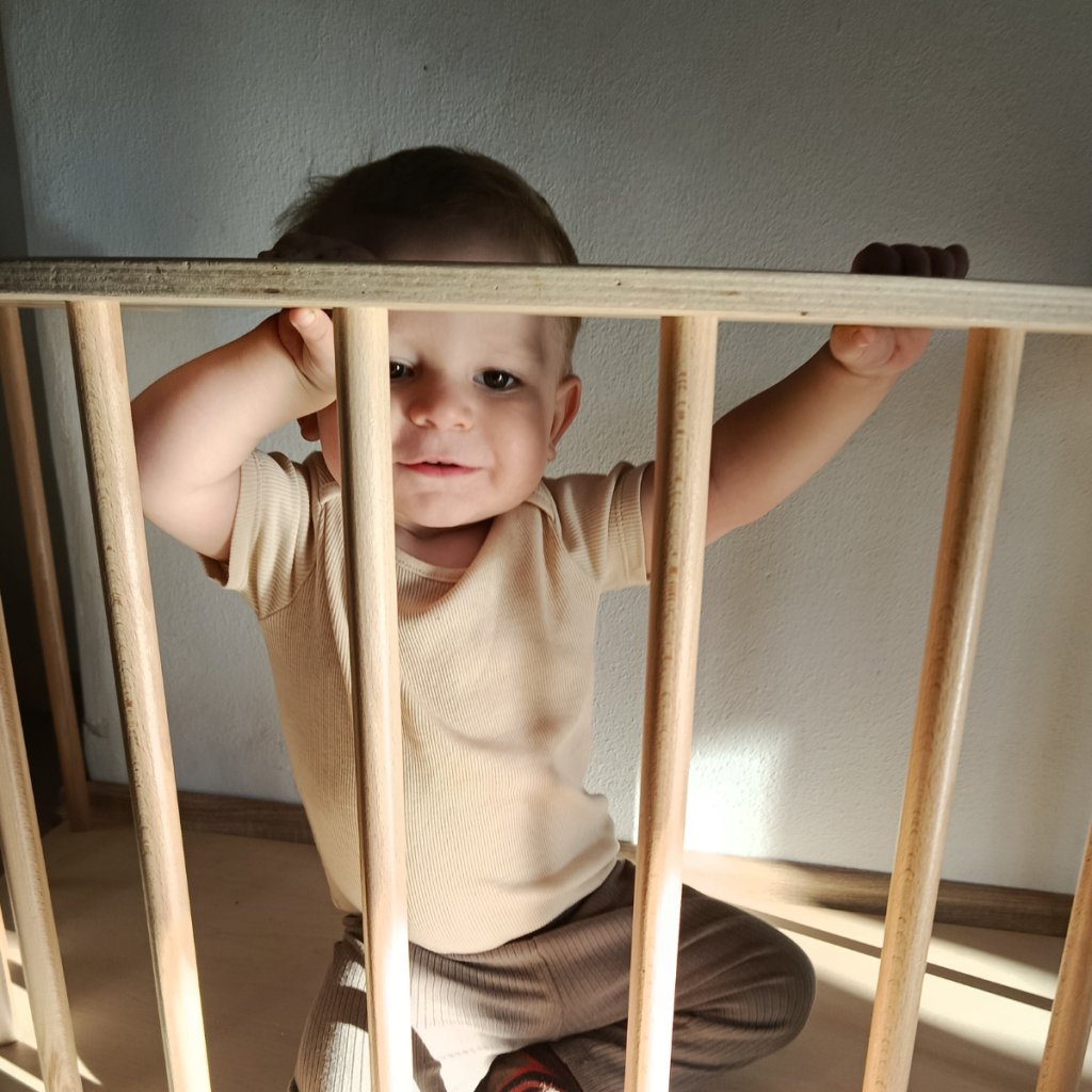 ARCO postavené u zdi. Dítě stojí na desce houpačky a nemůže ohrádku jednoduše odsunout. Dřevěné plochy nahoře slouží jako mini stoleček, kolem kterého budou dělat první krůčky.