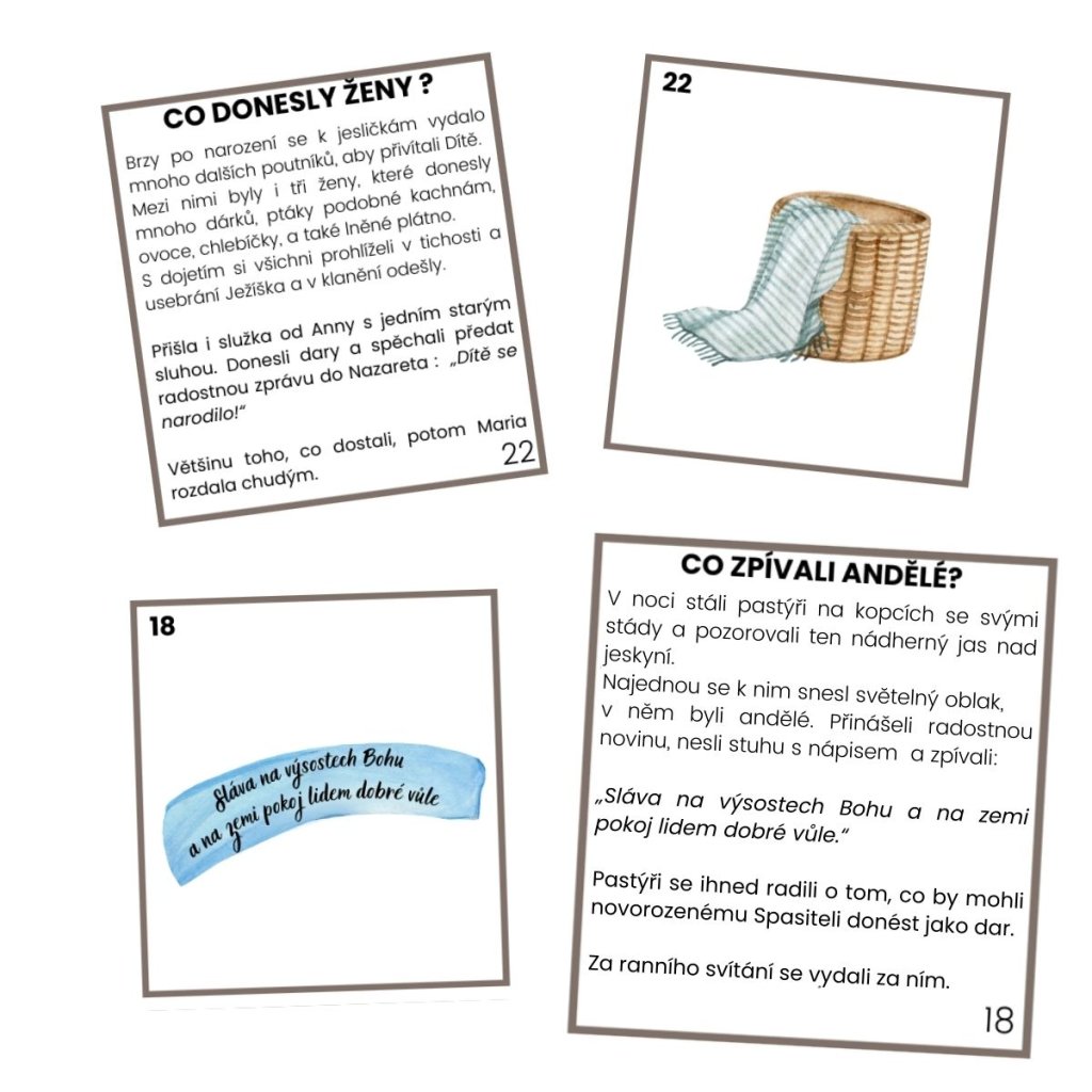 Kartičky si můžete postupně lepit na velký papír, případně postavy 2, 7, 8, 10, 12, 15, 18, 19, 21, 23 obstřihnout a nalepit na papír, tak vznikne malý Betlém.